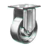 Roulettes roues en fonte usinée, peintes, (Voir roues série Q), pour fortes charges , monture en tôle d'acier estampée, forte épaisseur, finition zinguée chromatisée , pivot central boulonné à la platine, pivotement sur double rangées de billes traitées.